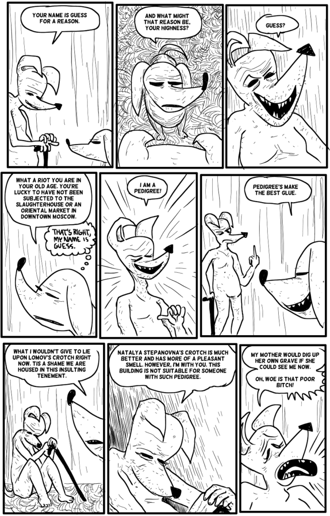 Squeezer laps up the remnants of his dish as NATALYA STEPANOVNA enters the