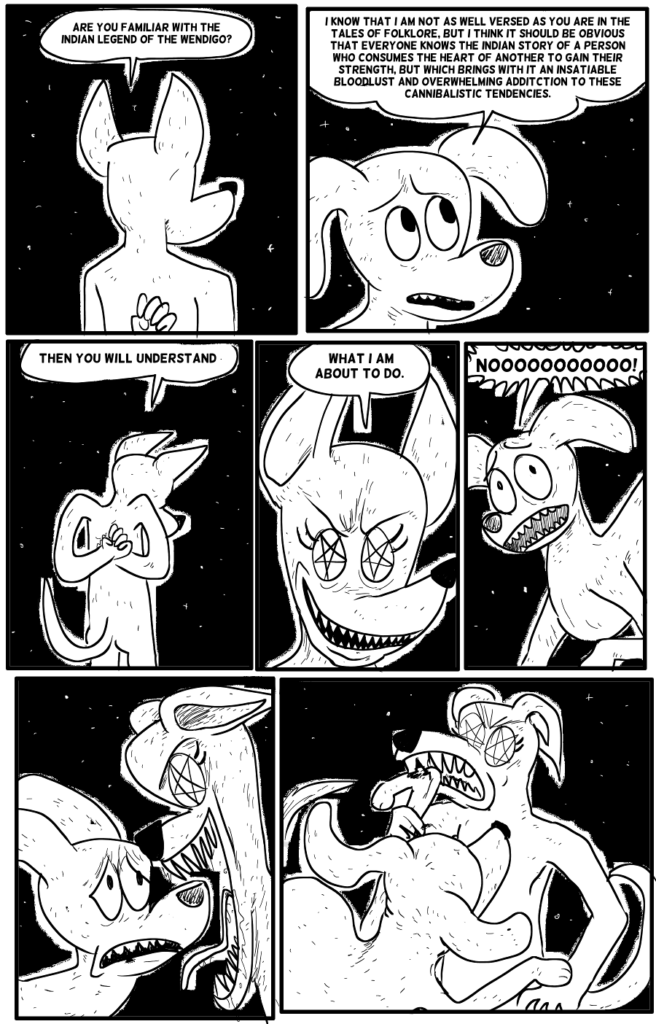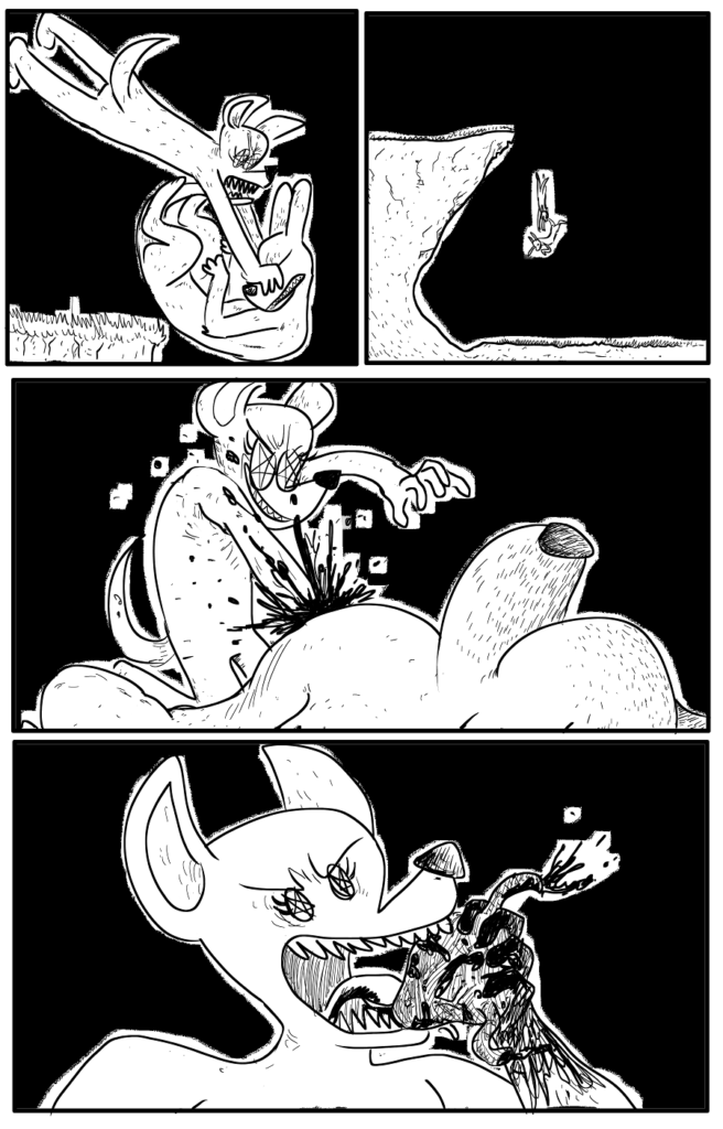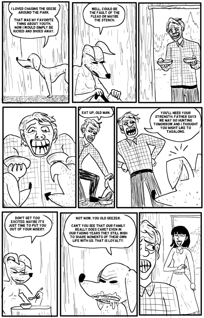 New panel: Scruffum’s and Squeezer have scraps nearby that they have been eating.