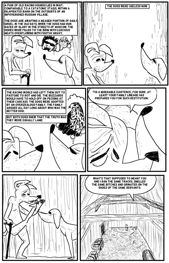 A pair of old racing hounds lies in wait, comparable to a catatonic stasis, within a